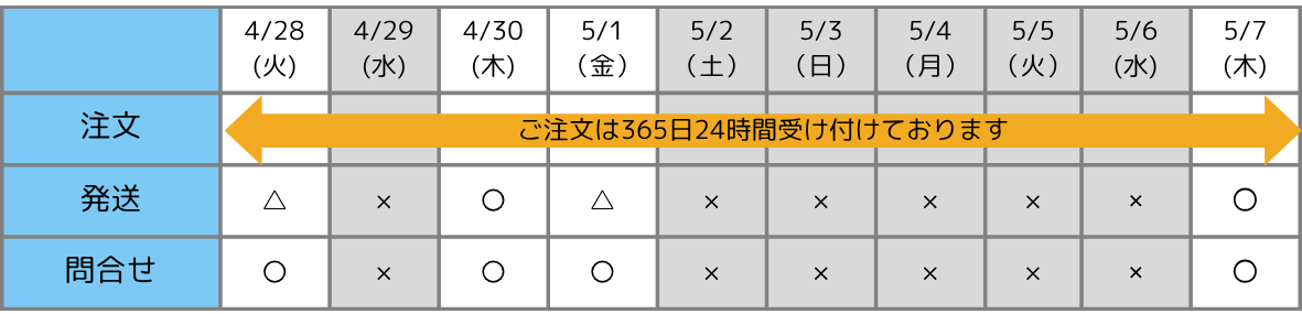 4月29日(水)、5月2日(土)~5月6日(水)は発送業務を停止いたします。